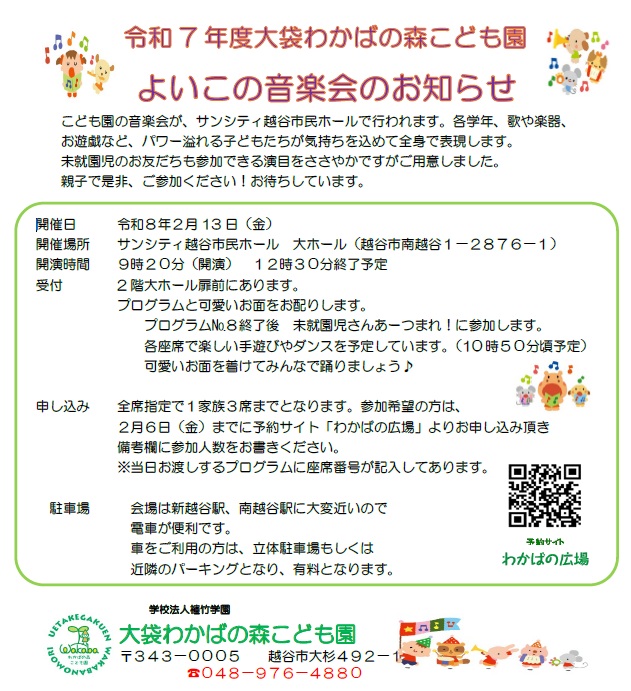 「未就園児教室予約サイト わかばのひろば」大袋わかば幼稚園、越谷わかば幼稚園、地域子育て支援センター森のひろばの予約ができます!